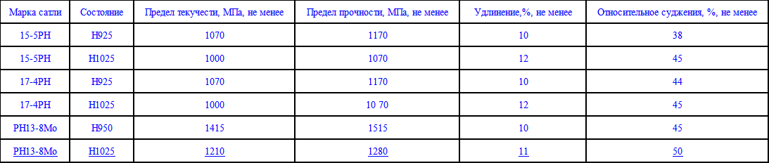 НТД: ASTM A564, ASTM A693, ASTM A705, AMS 5604, AMS 5622, AMS 5629, AMS 5643,AMS 5825, AMS 5827, AMS 5864, AMS 7474 или техническое задание